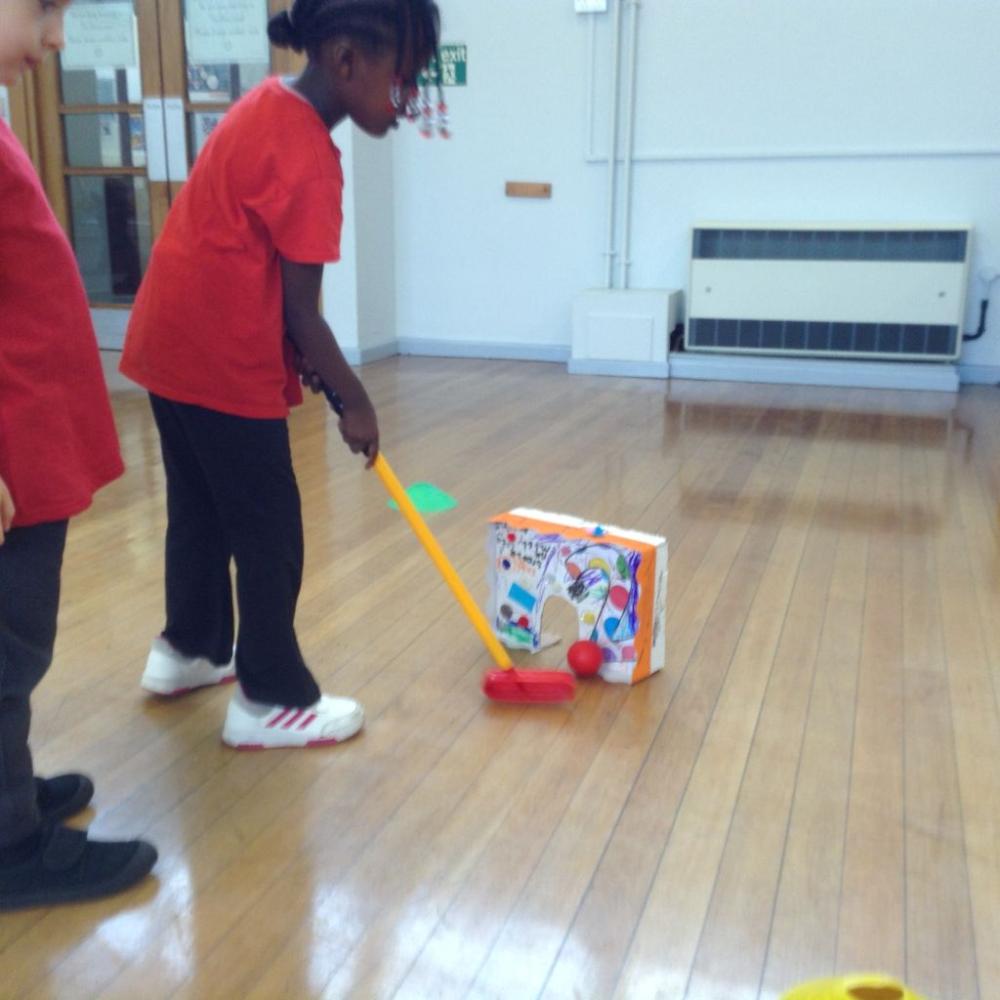 The children have been learning how to play golf during their P.E sessions and they have worked hard to create their own monster putting targets using recycled materials. The children had lots of fun designing and making their targets and they had a fantastic time using them to play their own mini golf game. The children amazed us with their wonderful creations and showed brilliant sportsmanship when working together to complete their courses.